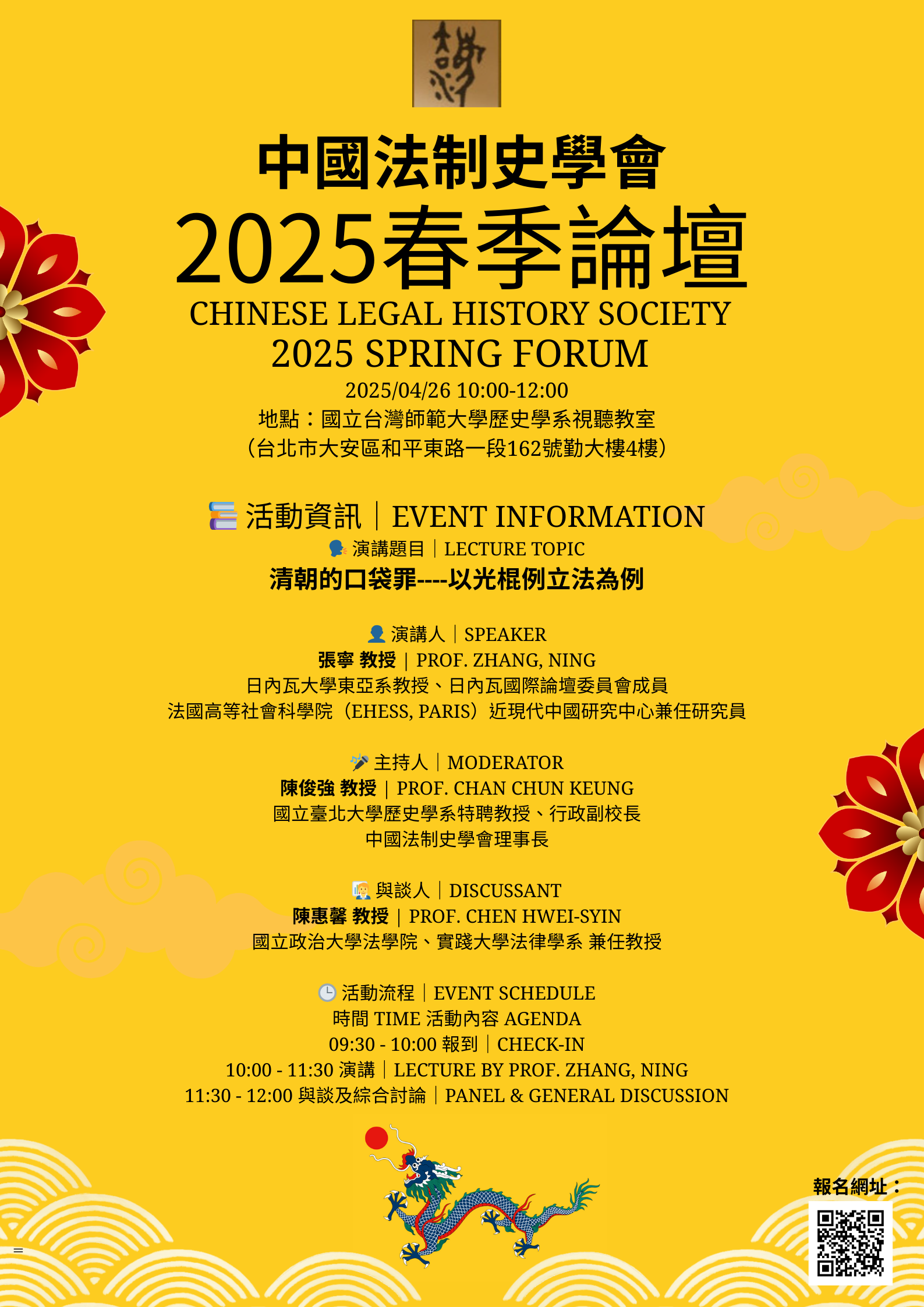 中國法制史學會,將於04/26 上午0930-1200 ,於 國立臺灣師範大學歷史學系視聽教室(台北市大安區和平東路一段162號勤大樓4樓)舉行春季論壇,本次特邀請日內瓦大學東亞系、日內瓦國際論壇委員會成員、法國高等社會科學院(EHESS, Paris)近現代中國研究中心兼任研究員的張寧教授,以清代的口袋罪作為本次的發表主題發表近期研究,敬請各位會員預留時間,前往參與。